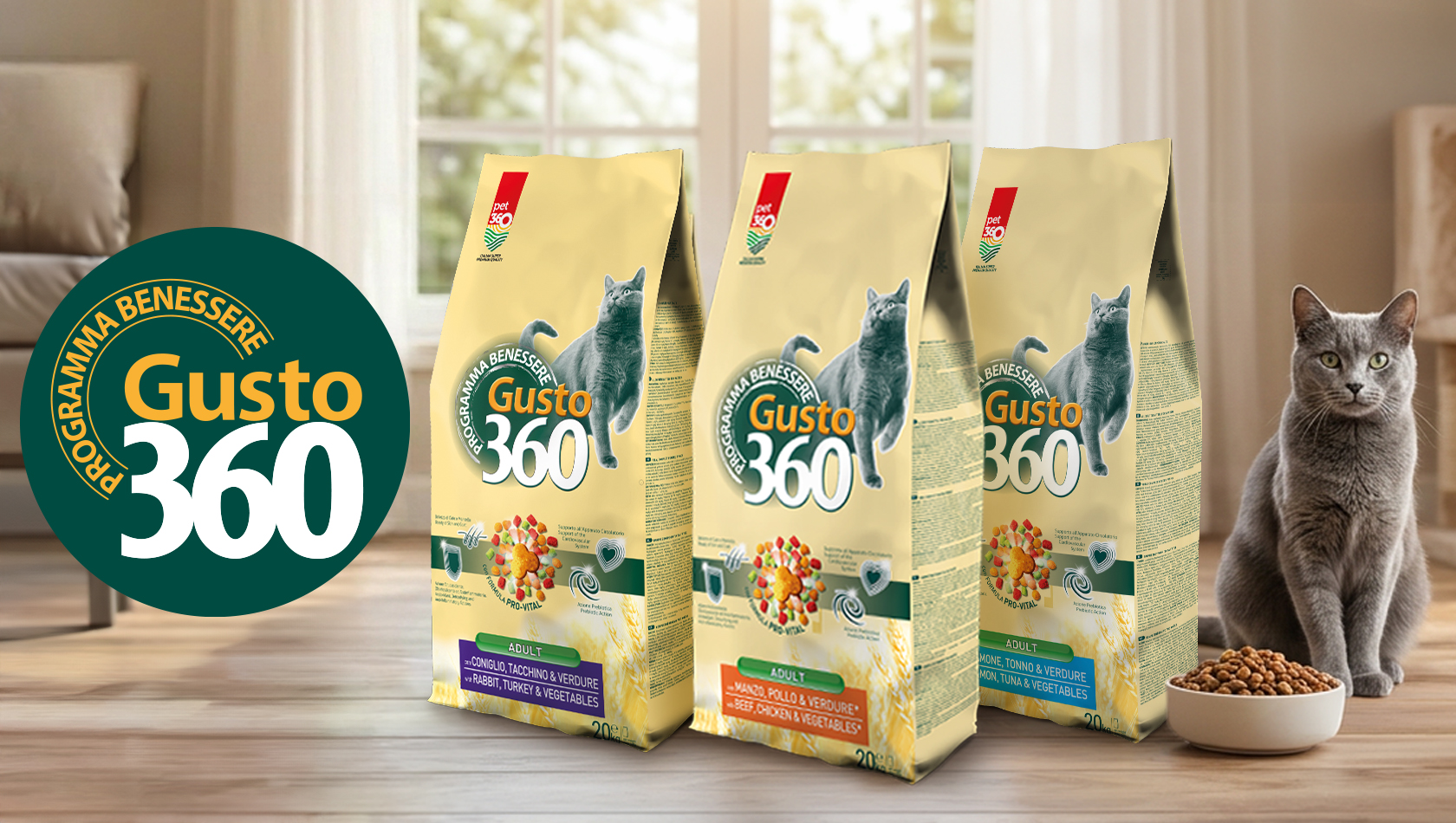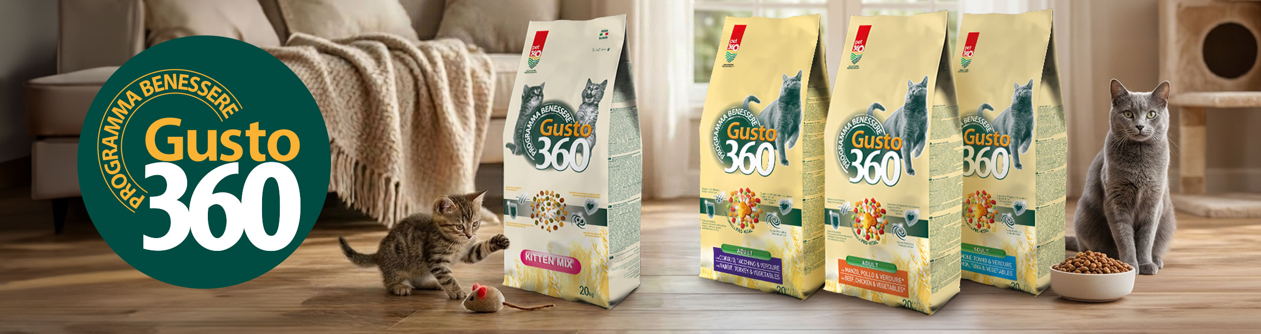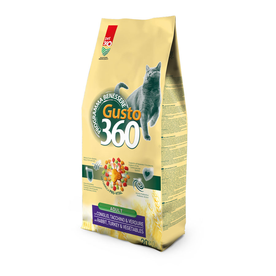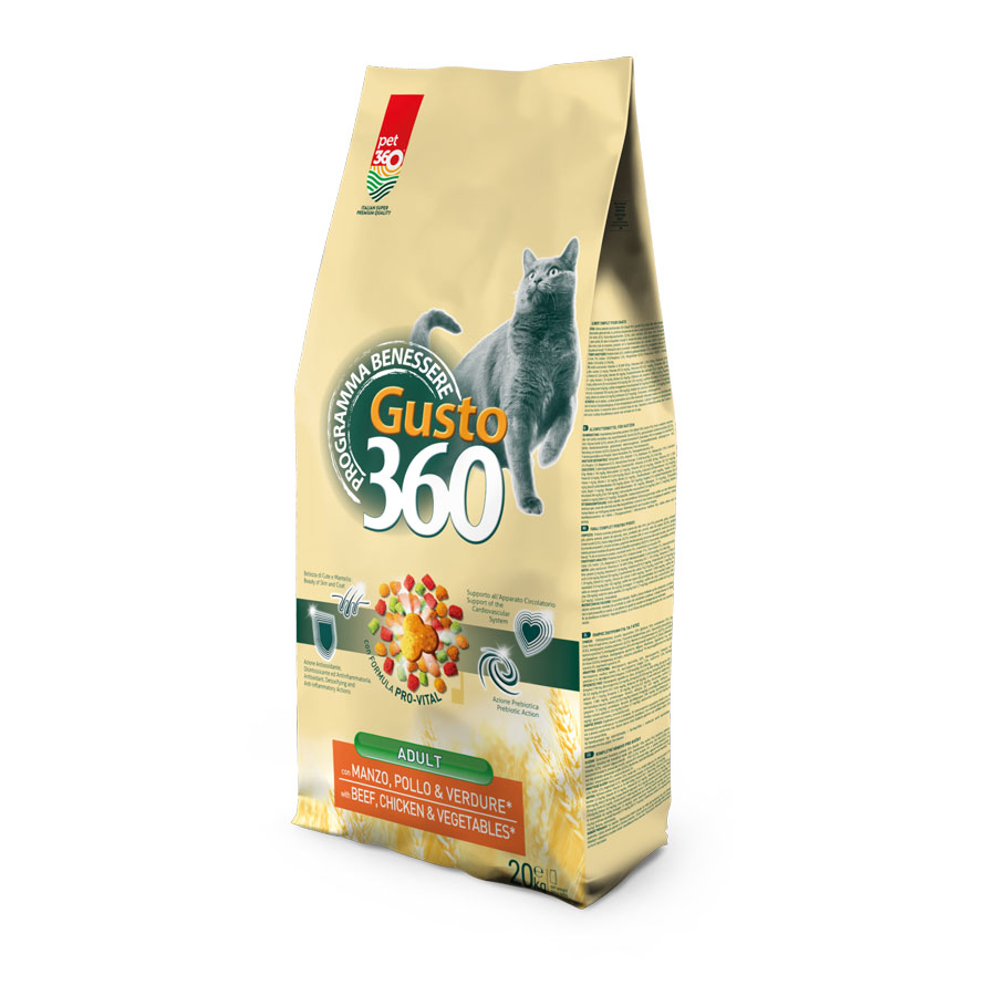 La linea Gusto360 Cat è pensata per offrire al gatto un’alimentazione completa e bilanciata con ricette gustose e nutrienti. Le formulazioni combinano proteine animali, cereali selezionati, fibre e vitamine per garantire il giusto apporto nutrizionale necessario al benessere quotidiano.