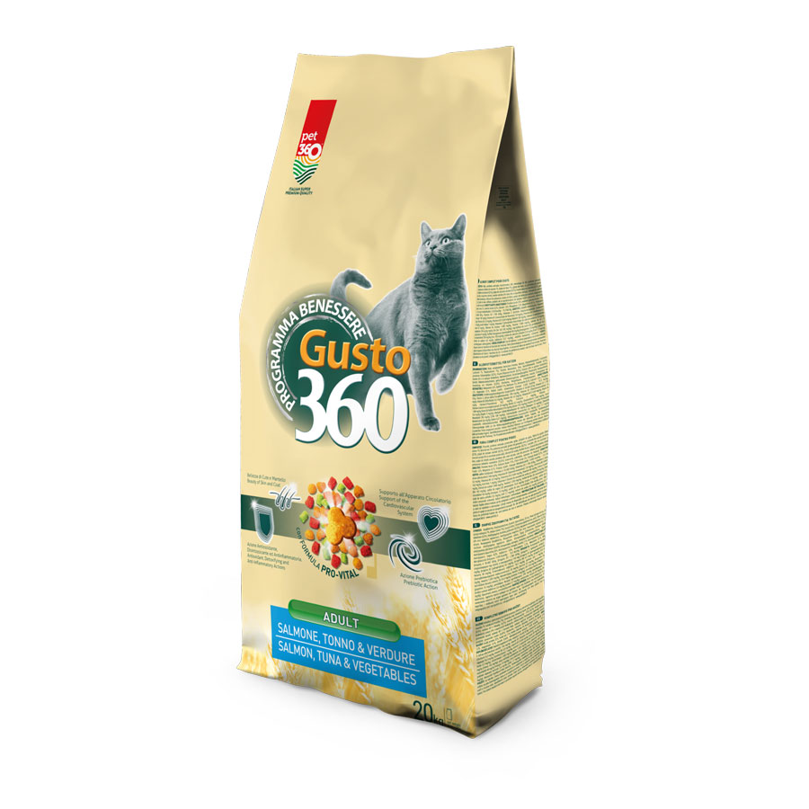 La linea Gusto360 Cat è pensata per offrire al gatto un’alimentazione completa e bilanciata con ricette gustose e nutrienti. Le formulazioni combinano proteine animali, cereali selezionati, fibre e vitamine per garantire il giusto apporto nutrizionale necessario al benessere quotidiano. Le ricette sono arricchite con taurina, elemento essenziale per il corretto funzionamento dell’apparato cardiaco e della vista, e con olio di pesce fonte di Omega 3, che contribuisce al mantenimento di pelle sana e mantello lucido.