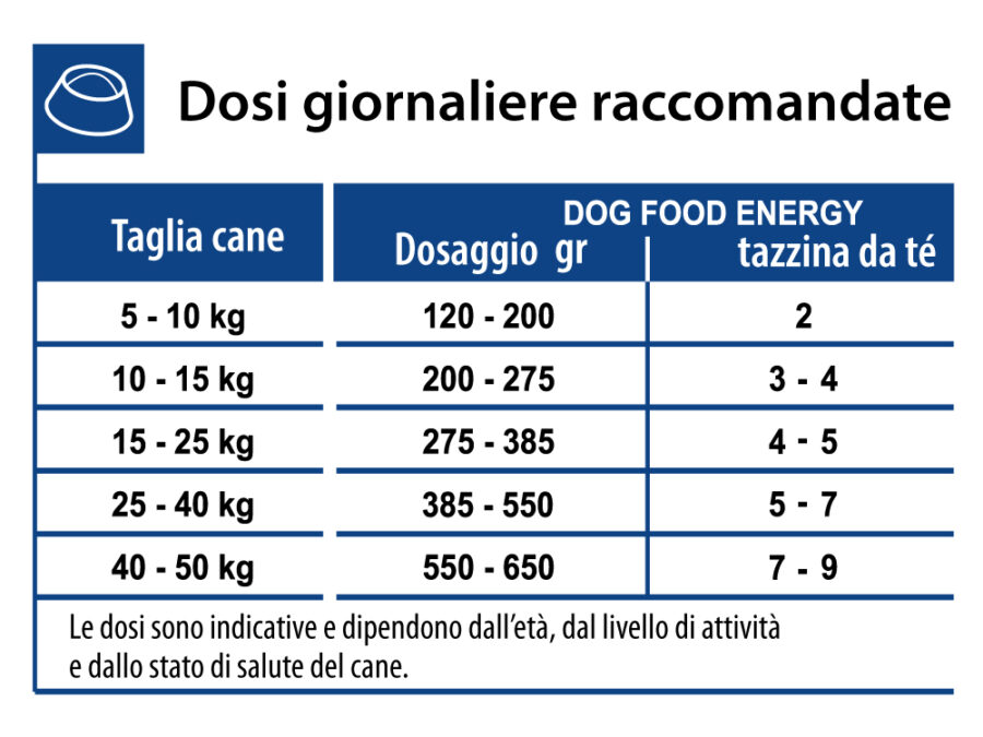 Somministrare il prodotto tal quale nella quantità consigliata in tabella e poi variare in base alle condizioni fisiche del cucciolo. Le quantità riportate in tabella sono puramente indicative in quanto possono variare in base al livello di attività svolta dall’animale e/o alle condizioni ambientali in cui vive. Il cambiamento di dieta deve essere sempre graduale (5-6 giorni totali). Lasciare sempre a disposizione acqua fresca e pulita.