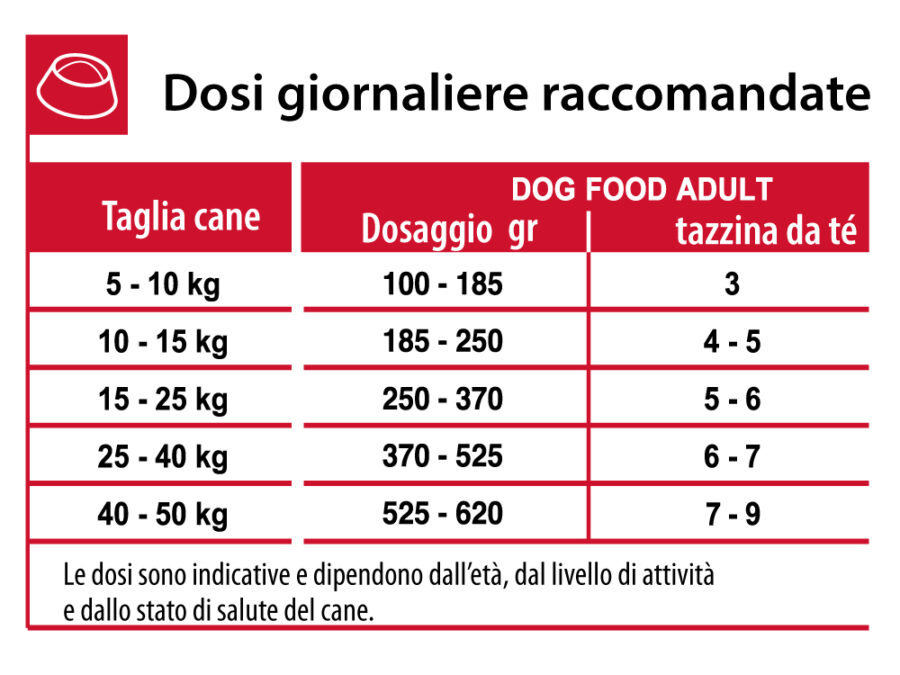 Somministrare il prodotto tal quale nella quantità consigliata in tabella e poi variare in base alle condizioni fisiche del cucciolo. Le quantità riportate in tabella sono puramente indicative in quanto possono variare in base al livello di attività svolta dall’animale e/o alle condizioni ambientali in cui vive. Il cambiamento di dieta deve essere sempre graduale (5-6 giorni totali). Lasciare sempre a disposizione acqua fresca e pulita.