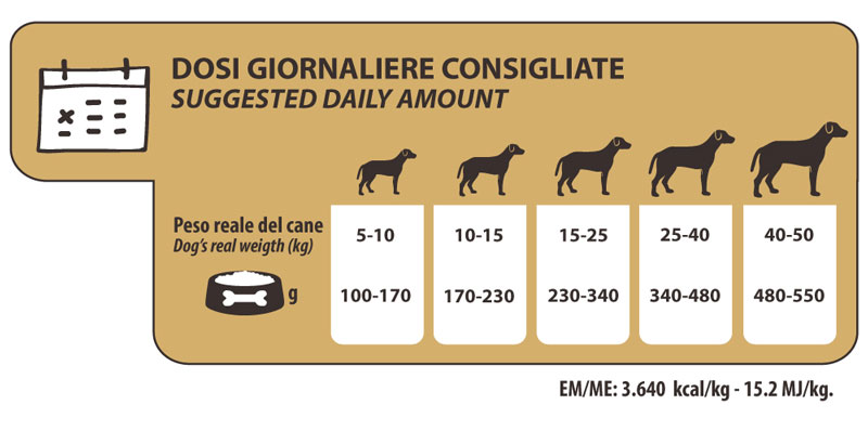 Somministrare il prodotto tal quale nella quantità consigliata in tabella e poi variare in base alle condizioni fisiche del cucciolo. Le quantità riportate in tabella sono puramente indicative in quanto possono variare in base al livello di attività svolta dall’animale e/o alle condizioni ambientali in cui vive. Il cambiamento di dieta deve essere sempre graduale (5-6 giorni totali). Lasciare sempre a disposizione acqua fresca e pulita.