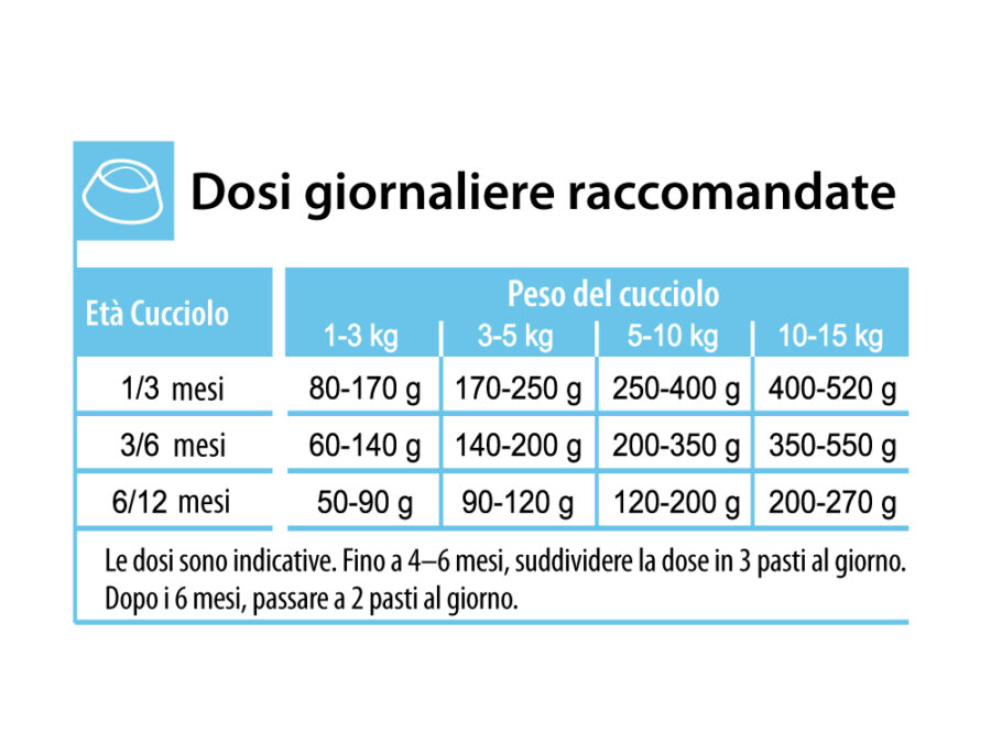 Somministrare il prodotto tal quale nella quantità consigliata in tabella e poi variare in base alle condizioni fisiche del cucciolo. Le quantità riportate in tabella sono puramente indicative in quanto possono variare in base al livello di attività svolta dall’animale e/o alle condizioni ambientali in cui vive. Il cambiamento di dieta deve essere sempre graduale (5-6 giorni totali). Lasciare sempre a disposizione acqua fresca e pulita.