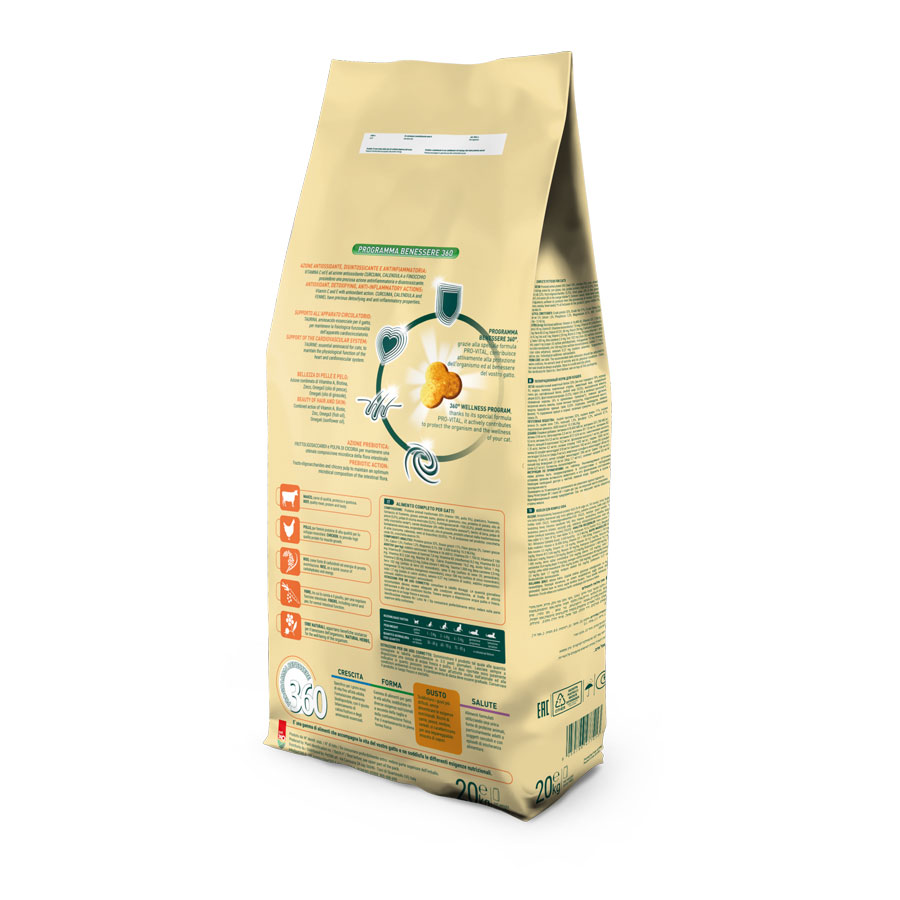 Alimento completo per gatti adulti, formulato con manzo e pollo come fonti proteiche principali per un gusto ricco e un apporto nutrizionale equilibrato. La presenza di taurina, aminoacido essenziale per il gatto, contribuisce al corretto funzionamento dell’apparato cardiaco e al mantenimento della vista. Arricchito con olio di pesce fonte di Omega 3, aiuta a sostenere la salute di cute e mantello, mentre FOS e polpa di cicoria favoriscono l’equilibrio della flora intestinale. Completano la ricetta vitamine, minerali ed erbe naturali ad azione antiossidante, per un’alimentazione quotidiana completa e bilanciata.