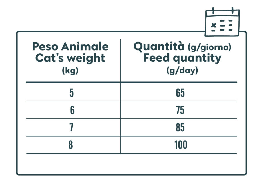 Proteina grezza 35%, Grassi grezzi 12%, Fibre grezze 4%, Ceneri grezze 7.5%, Ca 1.1%, P 0.9%, Mg 0.08%, Na 0.38%, K 0.7%, Omega3 totali 0.4%, Omega6 totali 1.8% (RATIO 1:4). Energia Metabolizzabile: 3600 kcal/kg.