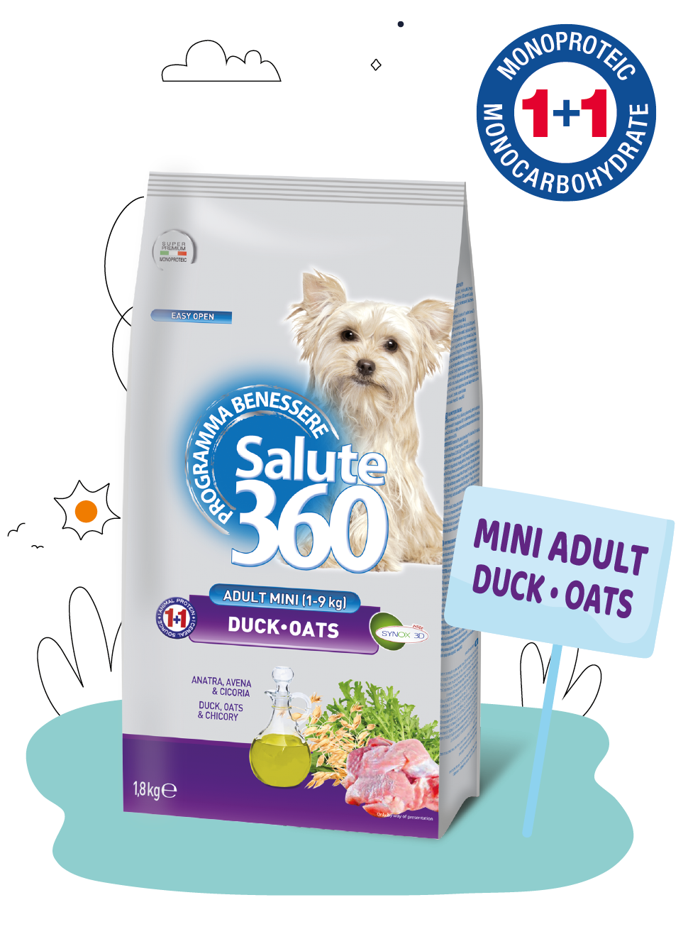 ΣΥΝΘΕΣΗ: Αφυδατωμένο κρέας (πάπια 25%), αποφλοιωμένη βρώμη 19%, βρώμη 18%, ζωικό λίπος, πρωτεΐνη πατάτας, αποξηραμένος πολτός κιχωρίου 2%, φρουκτοολιγοσακχαρίτες (FOS) 1%, ιχθυέλαιο 1%, ηλιέλαιο 1%, μαγιά μπύρας , προϊόντα αποξηραμένων αυγών, φωσφορικό όξινο ασβέστιο, χλωριούχο κάλιο, χλωριούχο νάτριο, yucca schidigera, γλυκοζαμίνη 400 mg/kg, προϊόντα που λαμβάνονται από την επεξεργασία βοτάνων (γαρύφαλλο, εσπεριδοειδή, αμπέλι, δεντρολίβανο, κουρκουμάς10,30,30,30, κουρκουμάς) /κιλό.