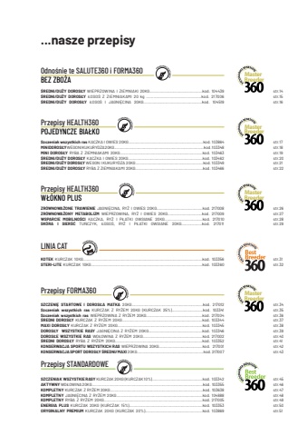 ...nasze przepisy BreederMasterstr.14 str.15 str.16 Odno%u015bnie te SALUTE360 i FORMA360 BEZ ZBO%u017bA %u015aREDNI/DU%u017bY DOROS%u0141Y WIEPRZOWINA I ZIEMNIAKI 20KG..............................................kod. 104439 %u015aREDNI/DU%u017bY DOROS%u0141Y %u0141OSO%u015a Z ZIEMNIAKAMI 20 kg .............................................kod. 217006 %u015aREDNI/DU%u017bY DOROS%u0141Y %u0141OSO%u015a I JAGNI%u0118CINA 20KG...................................................kod. 104519 str.17 str.18 str.19 str.20 str.21 str.22 Przepisy HEALTH360 POJEDYNCZE BIA%u0141KO Szczeniak wszystkich ras KACZKA I OWIES 20KG.................................................................kod. 103864 MINI DOROS%u0141Y WEGON I KUKURYDZA 20KG..............................................................................kod. 103348 MINI DOROS%u0141Y RYBA Z ZIEMNIAKAMI 20KG........................................................................kod. 103463 %u015aREDNI/DU%u017bY DOROS%u0141Y KACZKA I OWIES 20KG.................................................................kod. 103462 %u015aREDNI/DU%u017bY DOROS%u0141Y WEGON I KUKURYDZA 20KG...........................................................kod. 103349 %u015aREDNI/DU%u017bY DOROS%u0141Y RYBA Z ZIEMNIAKAMI 20KG...........................................................kod. 103466 BreederMasterstr.34 str.35 str.36 str.37 str.38 str.39 str.40 str.41 str.42 str.43 Przepisy FORMA360 SZCZENI%u0118 STARTOWE I DOROS%u0141A MATKA 20KG..............................................................kod. 217012 Szczeniak wszystkich ras KURCZAK Z RY%u017bEM 20KG (KURCZAK 25%)...........................kod. 103341 Szczeniak wszystkich ras WIEPRZOWINA Z RY%u017bEM 20KG.................................................kod. 217004 %u015aREDNI DOROS%u0141Y KURCZAK Z RY%u017bEM 20KG......................................................................kod. 103344 MAXI DOROS%u0141Y KURCZAK Z RY%u017bEM 20KG..........................................................................kod. 103345 DOROS%u0141Y WSZYSTKIE RASY JAGNI%u0118CINA Z RY%u017bEM 20KG...............................................kod. 103346 DOROS%u0141E WSZYSTKIE RAS WO%u0141OWINA Z RY%u017bEM 20KG....................................................kod. 217002 %u015aREDNI DOROS%u0141Y RYBA Z RY%u017bEM 20KG............................................................................kod. 103352 KONSERWACJA SPORTU WSZYSTKICH RAS WIEPRZOWINA 20KG......................................kod. 217001 KONSERWACJA SPORT DOROS%u0141Y %u015aREDNI/MAXI 20KG..........................................................kod. 217007 BreederMasterstr.45 str.46 str.47 str.48 str.49 str.50 str.51 Przepisy STANDARDOWE SZCZENIAK WSZYSTKIE RASY KURCZAK 20KG (KURCZAK 10%)............................................kod. 103342 AKTYWNY WO%u0141OWINA 20KG.................................................................................................kod. 103355 KOMPLETNY KURCZAK Z RY%u017bEM 20KG.................................................................................kod. 103638 KOMPLETNY JAGNI%u0118CINA Z RY%u017bEM 20KG...........................................................................kod. 104888 KOMPLETNY RYBA Z RY%u017bEM 20KG......................................................................................kod. 217005 ENERGIA PLUS KURCZAK 20KG (KURCZAK 15%)................................................................kod. 103353 ORYGINALNY PREMIUM KURCZAK 20KG (KURCZAK 20%)..................................................kod. 103869 LINIA CAT KOTEK KURCZAK 10KG........................................................................................................kod. 103356 STERI-LITE KURCZAK 10KG.................................................................................................kod. 103360 str.31 str.32 str.26 str.27 str.28 str.29 Przepisy HEALTH360 W%u0141%u00d3KNO PLUS ZR%u00d3WNOWA%u017bONE TRAWIENIE JAGNI%u0118CINA, RY%u017b I OWIES 20KG........................................kod. 217008 ZR%u00d3WNOWA%u017bONY METABOLIZM WIEPRZOWINA, RY%u017b I OWIES 20KG..............................kod. 217009 WSPARCIE MOBILNO%u015aCI KACZKA, RY%u017b I P%u0141ATKI OWSIANE 20KG.................................kod. 217010 SK%u00d3RA I SIER%u015a%u0106 TU%u0143CZYK, %u0141OSO%u015a, RY%u017b I P%u0141ATKI OWSIANE 20KG..................kod. 217011 BreederMaster