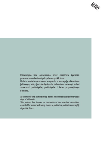 Innowacyjna linia opracowana przez ekspert%u00f3w %u017cywienia, przeznaczona dla doros%u0142ych ps%u00f3w wszystkich ras. Linia ta zosta%u0142a opracowana w oparciu o koncepcj%u0119 mikrobiomu jelitowego, kt%u00f3ry jest niezb%u0119dny dla dobrostanu zwierz%u0105t, dzi%u0119ki zawarto%u015bci prebiotyk%u00f3w, probiotyk%u00f3w i %u0142atwo przyswajalnego b%u0142onnika. An innovative line formulated by expert nutritionists designed for adult dogs of all breeds.This petfood line focuses on the health of the intestinal microbiota, essential for animal well-being, thanks to prebiotics, probiotics and highly digestible fibers.NOWY