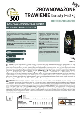 26B%u0142onnik owsiany Owies korzystnie wp%u0142ywa na serce, trzustk%u0119, uk%u0142ad nerwowy i odporno%u015bciowy, dlatego zaleca si%u0119 wprowadzenie go do zbilansowanej diety psa. Oats fibreOat is good for the heart, pancreas, nervous system and immune system, so it is advisable to introduce them into the dog%u2019s balanced diet.Kozieradka Badania kliniczne dowodz%u0105 skuteczno%u015bci tej ro%u015bliny w walce z cukrzyc%u0105. Jej nasiona pomagaj%u0105 szybko obni%u017cy%u0107 poziom cukru we krwi. FenugreekClinical studies demonstrate the validity of this plant in the fight against diabetes. The seeds help%u2019s a very rapid lowering of blood sugar levels.Oliwa z oliwek Dzi%u0119ki zawarto%u015bci t%u0142uszcz%u00f3w jednonienasyconych i zdolno%u015bci pobudzania produkcji %u017c%u00f3%u0142ci, oliwa z oliwek pomaga emulgowa%u0107 t%u0142uszcze i usprawnia trawienie. Olive oilDue to its high content of monounsaturated fatty acids and its capacity to enhance bile secretion, olive oil facilitates lipid emulsification and promotes more efficient gastrointestinal absorption.Garcinia Cambogia Jego ekstrakt jest stosowany jako naturalny %u015brodek wspomagaj%u0105cy odchudzanie poprzez stymulacj%u0119 metabolizmu i redukcj%u0119 uczucia g%u0142odu. Garcinia CambogiaIts extract is used as a natural remedy for losing weight by stimulating the metabolism and reducing the feeling of hunger. WAGA PSA DOROS%u0141EGO (kg) 2 4 6 8 10 20 30 40 50POZIOM AKTYWNO%u015aCINiska aktywno%u015b%u0107 (< 1 godz./dzie%u0144) 50 85 115 140 170 285 385 475 560%u015arednia aktywno%u015b%u0107 (oko%u0142o 1 godz./dzie%u0144) 60 100 135 165 195 325 445 550 650Wysoka aktywno%u015b%u0107 (oko%u0142o 3 godz./dzie%u0144) 65 110 150 190 120 375 505 625 740Sk%u0142onno%u015b%u0107 do oty%u0142o%u015bci 45 80 110 135 160 270 365 450 530EM/ME (NRC-2006a.) = 3290 kcal/kgZALECANE DZIENNE PORCJEZR%u00d3WNOWA%u017bONE TRAWIENIE Doros%u0142y 1-50 kg KOMPOZYCJA: Suszona jagni%u0119cina (min. 25%), br%u0105zowy ry%u017c (min. 25%), kukurydza pe%u0142noziarnista, owies (owies pe%u0142noziarnisty 8,5%; w%u0142%u00f3kno owsiane 2,7%), bia%u0142ko grochu, mi%u0105%u017csz buraczany, t%u0142uszcz z kaczki, lignoceluloza, hydrolizat w%u0105troby, minera%u0142y, dro%u017cd%u017ce browarnicze, oliwa z oliwek 1%, w%u0142%u00f3kno jab%u0142kowe, olej z %u0142ososia, korze%u0144 cykorii (inulina), ekstrakt z juki schidigera, substancje botaniczne (garbniki glikozydowe (Castanea sativa), owoc dzikiej r%u00f3%u017cy (Rosa canina), nagietek lekarski (Calendula officinalis), kwiaty nagietka (Tagetes erecta), garcinia (Garcinia cambogia) 0,1%, kozieradka (Trigonella foenum-graecum) 0,02%, koperek (Anethum graveolens), chlorowodorek glukozaminy 1150 mg/kg, siarczan chondroityny 850 mg/kg. SK%u0141ADNIKI ANALITYCZNE: Bia%u0142ko surowe 22%, W%u0142%u00f3kno surowe: 5%, T%u0142uszcz surowy: 10%, Popi%u00f3%u0142 surowy: 8,5%. EM (NRC-2006a.) = 3290 kcal/kg DODATKI (na kg): Dodatki od%u017cywcze: 3a672a Witamina A 18000 IU; 3a671 Witamina D3 1150 IU; 3a700 Witamina E 240 mg; 3a370 Tauryna 1200 mg; 3a910 L-karnityna 100 mg; 3a890 Chlorek choliny 2000 mg; 3b103 %u017belazo (siarczan %u017celaza(II) jednowodny) 95 mg; 3b201 Jod (jodek potasu) 2 mg; 3b405 Mied%u017a (siarczan miedzi(II) pi%u0119ciowodny) 11 mg/kg; 3b502 Mangan (tlenek manganu(II)) 16 mg; 3b603 Cynk (tlenek cynku) 75 mg; 3b607 Cynk (chelat cynku hydratu glicyny) 25 mg; 3b801 Selen (selenin sodu) 0,2 mg; Dodatki technologiczne: 1b306 Przeciwutleniacze (bogate w tokoferole naturalne ekstrakty z olej%u00f3w ro%u015blinnych) 300 mg. Dodatki organoleptyczne: 2b280-ex Ekstrakt z li%u015bci Melissa officinalis L.; 2b139a-ex Ekstrakt z cytryny. Jagni%u0119cina 25% Br%u0105zowy ry%u017c 25% Bia%u0142ka 22% T%u0142uszcze 10% BreederMaster20 kg Dorsz. 217008 DLA %u0141ATWEGO I ZR%u00d3WNOWA%u017bONEGO TRAWIENIA FOR A SIMPLY & BALANCED DIGESTIONJAGNI%u0118CINA %u2022 RY%u017b %u2022 OWIES Owies 11,2% PL %u015brednica 9/11 mm grubo%u015b%u010710/12 mm KROKIET/ CROQUETTE: NOWY COMPOSITION: %u00a0Dehydrated lamb (min. 25%), brewers rice (min. 25%), whole maize , oats (whole oat 8,5%; oat fibre (vitacel) 2,7%), pea protein , beet pulp , duck fat, lignocellulose , liver hydrolysate , minerals , brewer%u2019s yeast , olive oil 1%, apple fiber , salmon oil , botanicals (glucosidic tannins (Castanea sativa) , rose hip (Rosa canina), calendula (Calendula officinalis) , Marigold flower (Tagetes erecta) , garcinia (Garcinia cambogia) 0,1%, fenugreek (Trigonella foenum-graecum) 0,02%, dill (Anethum graveolens), chicory root (inuline), Yucca schidigera, glucosamine hydrochloride 1.150mg, chondroitin sulphate 850mg. ANALYTICAL CONSTITUENTS: Crude protein 22%, Crude fibre: 5%, Crude fat: 10%, Crude ash: 8.5% EM (NRC-2006a.) = 3290 kcal/kg ADDITIVES (per kg): Nutritional additives: 3a672a Vitamin A 18,000 IU, 3a671 Vitamin D3 1,150 IU, 3a700i Vitamin E 240 mg, 3a370 Taurine 1,200 mg, 3a910 L-carnitine 100 mg, 3a890 Choline chloride 2,000 mg, 3b103 Iron (ferrous sulfate monohydrate) 95 mg, 3b203 Iodine (potassium iodide) 2 mg, 3b405 Copper (copper sulfate pentahydrate) 11 mg, 3b506 Manganese (manganese (II) oxide) 16 mg, 3b605 Zinc (zinc oxide) 75 mg, 3b605 Zinc (zinc glycine chelate hydrate) 25 mg, 3b802 Selenium (sodium selenite) 0.2 mg. Technological additives: 1b306 Antioxidants (natural extracts rich in tocopherols from vegetable oils) 300 mg. Organoleptic additives: 2b280-ex Melissa officinalis L leaf extract, 2b139a-ex Lemon extract.EN