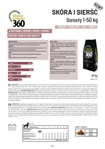29B%u0142onnik owsiany Owies korzystnie wp%u0142ywa na serce, trzustk%u0119, uk%u0142ad nerwowy i odporno%u015bciowy, dlatego zaleca si%u0119 wprowadzenie go do zbilansowanej diety psa. Oats fibreOat is good for the heart, pancreas, nervous system and immune system, so it is advisable to introduce them into the dog%u2019s balanced diet.Oliwa z oliwek Bogaty w kwasy Omega 3, kt%u00f3re poprawiaj%u0105 wygl%u0105d i zdrowie sier%u015bci. Zawiera r%u00f3wnie%u017c witamin%u0119 E, niezb%u0119dn%u0105 do prawid%u0142owego funkcjonowania uk%u0142adu nerwowego i m%u00f3zgu. Olive oilRich in Omega3 to improve the appearance and health of the coat. It also contains vitamin E and lecithin, a liquid substance essential for the regular functioning of the nervous system and brain.Jagoda Bogata w przeciwutleniacze, %u017curawina od dawna jest stosowana w leczeniu r%u00f3%u017cnych schorze%u0144, takich jak rany sk%u00f3rne i egzema. %u017burawina jest bogata w przeciwutleniacze. BlueberryRich in antioxidants, have long been used to support a range of issues such as skin wounds and eczema. Cranberries are also rich in antioxidants.Cynk U ps%u00f3w niski poziom cynku w diecie mo%u017ce powodowa%u0107 dermatozy. ZincIn dogs, low levels of zinc in the diet can cause dermatosis.SK%u00d3RA I SIER%u015a%u0106 Doros%u0142y 1-50 kg KOMPOZYCJA: Suszona m%u0105czka rybna (tu%u0144czyk min. 23%; %u0142oso%u015b min. 5%), br%u0105zowy ry%u017c (min. 25%), kukurydza pe%u0142noziarnista, owies (owies pe%u0142noziarnisty 9,5%; w%u0142%u00f3kno owsiane (vitacel) 2,5%), olej z %u0142ososia, mi%u0105%u017csz buraczany, lignoceluloza, hydrolizat w%u0105troby, minera%u0142y, dro%u017cd%u017ce browarnicze, oliwa z oliwek 1%, b%u0142onnik jab%u0142kowy, korze%u0144 cykorii (inulina), ekstrakt z juki schidigera, substancje botaniczne (garbniki glikozydowe (Castanea sativa), bor%u00f3wki (0,1%), chlorowodorek glukozaminy, siarczan chondroityny). SK%u0141ADNIKI ANALITYCZNE: Bia%u0142ko surowe 22%, W%u0142%u00f3kno surowe 5%, T%u0142uszcz surowy 15%, Popi%u00f3%u0142 surowy 7,5%. EM (NRC-2006a.) = 3542 kcal/kg DODATKI (na kg): Dodatki od%u017cywcze: 3a672a Witamina A 18000 IU; 3a671 Witamina D3 1150 IU; 3a700 Witamina E 240 mg; 3a370 Tauryna 1200 mg; 3a910 L-karnityna 100 mg; 3a890 Chlorek choliny 2000 mg; 3b103 %u017belazo (siarczan %u017celaza(II) jednowodny) 95 mg; 3b201 Jod (jodek potasu) 2 mg; 3b405 Mied%u017a (siarczan miedzi(II) pi%u0119ciowodny) 11 mg/kg; 3b502 Mangan (tlenek manganu(II)) 16 mg; 3b603 Cynk (tlenek cynku) 75 mg; 3b607 Cynk (chelat cynku hydratu glicyny) 25 mg; 3b801 Selen (selenin sodu) 0,2 mg; Dodatki technologiczne: 1b306 Przeciwutleniacze (bogate w tokoferole naturalne ekstrakty z olej%u00f3w ro%u015blinnych) 300 mg. Dodatki organoleptyczne: 2b280-ex ekstrakt z li%u015bci Melissa officinalis L. PL %u0141oso%u015b 5% Br%u0105zowy ry%u017c 25% Bia%u0142ka 22% T%u0142uszcze 15% BreederMaster20 kg Dorsz. 217011 %u0141OSO%u015a %u2022 TU%u0143CZYK %u2022 RY%u017b %u2022 OWIES Owies 12% UTRZYMANIE ZDROWEJ SK%u00d3RY I SIER%u015aCI SUPPORT SKIN & COAT BEAUTY WAGA PSA DOROS%u0141EGO (kg) 2 4 6 8 10 20 30 40 50POZIOM AKTYWNO%u015aCINiska aktywno%u015b%u0107 (< 1 godz./dzie%u0144) 45 75 100 125 145 245 335 415 490%u015arednia aktywno%u015b%u0107 (oko%u0142o 1 godz./dzie%u0144) 50 85 115 145 170 285 385 480 570Wysoka aktywno%u015b%u0107 (oko%u0142o 3 godz./dzie%u0144) 60 100 130 165 190 325 440 545 645Sk%u0142onno%u015b%u0107 do oty%u0142o%u015bci 40 70 95 120 140 235 315 395 465EM/ME (NRC-2006a.) = 3542 kcal/kgZALECANE DZIENNE PORCJETu%u0144czyk 23% %u015brednica 9/11 mm grubo%u015b%u010710/12 mm KROKIET/ CROQUETTE: NOWY COMPOSITION: %u00a0Dehydrated fish meals (tuna min. 23%; salmon min. 5%), brewers rice (min. 25%), whole maize, oats (whole oats 9.5%; oat fibre (vitacel) 2.5%), salmon oil, beet pulp, lignocellulose, liver hydrolysate, minerals, brewer%u2019s yeast, olive oil 1%, apple fibre, chicory root (inuline), Yucca schidigera extract, botanicals (glucosidic tannins (Castanea sativa), blueberries 0,1%, glucosamine hydrochloride, chondroitin sulphate. ANALYTICAL CONSTITUENTS: Crude protein 22%, Crude fibre: 5%, Crude fat 15%, Crude ash 7.5% EM (NRC-2006a.) = 3542 kcal/kg ADDITIVES (per kg): Nutritional additives: 3a672a Vitamin A 18,000 IU, 3a671 Vitamin D3 1,150 IU, 3a700i Vitamin E 240 mg, 3a370 Taurine 1,200 mg, 3a910 L-carnitine 100 mg, 3a890 Choline chloride 2,000 mg, 3b103 Iron (ferrous sulfate monohydrate) 95 mg, 3b203 Iodine (potassium iodide) 2 mg, 3b405 Copper (copper sulfate pentahydrate) 11 mg, 3b506 Manganese (manganese (II) oxide) 16 mg, 3b605 Zinc (zinc oxide) 75 mg, 3b605 Zinc (zinc glycine chelate hydrate) 25 mg, 3b802 Selenium (sodium selenite) 0.2 mg. Technological additives: 1b306 Antioxidants (natural extracts rich in tocopherols from vegetable oils) 300 mg. Organoleptic additives: 2b280-ex Extract of Melissa officinalis L. leaves.EN