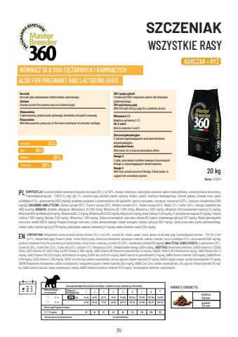 35Kurczak Ry%u017c Bia%u0142ka T%u0142uszcze 25% 16% 30% 20% ZALECANA DZIENNA PORCJA (G) DLA SZCZENI%u0104T / SUGGESTED DAILY AMOUNT (g) FOR PUPPIESWaga psa doros%u0142ego (kg)Wiek szczeni%u0119cia (w miesi%u0105cach)2 - 45 - 9Suki w ci%u0105%u017cy/Pregnant femalesSuki karmi%u0105ce/Lactating females(g)248-554955-40133-402940-357112-139141-1001266102-124125-89112592-109109-7898478-9192-6683363-7474-53679134-167169-1221528155-111123-153139Do woli/ad libitum6%u00b0, 7%u00b0, 8%u00b0 tydzie%u0144SZCZENIAK WSZYSTKIE RASY KOMPOZYCJA: Suszone bia%u0142ko zwierz%u0119ce (suszony kurczak 25%), ry%u017c 16%, t%u0142uszcz zwierz%u0119cy, kukurydza, pszenica, gluten kukurydziany, suszony mi%u0105%u017csz buraczany, fruktooligosacharydy - FOS (1%), olej rybi 1%, suszone jaja, dro%u017cd%u017ce piwne, suszony mi%u0105%u017csz cykorii, fosforan dwuwapniowy, chlorek potasu, chlorek sodu, jukka schidigera 0,1%, glukozamina (400 mg/kg), produkty uzyskane z przetwarzania zi%u00f3%u0142 (go%u017adziki, owoce cytrusowe, rozmaryn, kurkuma) 0,03%, siarczan chondroityny (100 mg/kg). SK%u0141ADNIKI ANALITYCZNE: Bia%u0142ko surowe 30%, T%u0142uszcz surowy 20%, W%u0142%u00f3kno surowe 2,5%, Popi%u00f3%u0142 surowy 6,5%, Wap%u0144 1,1%, Fosfor 0,9%. Energia metaboliczna 4100 kcal/kg. DODATKI: Dodatki od%u017cywcze: Witamina A 22 000 IU/kg, Witamina D3 1 500 IU/kg, Witamina E 500 mg/kg, Witamina B1 (monoazotan tiaminy) 1,3 mg/kg, Witamina B2 (ryboflawina) 6 mg/kg, Witamina B6 1,3 mg/kg, Witamina B12 0,03 mg/kg, Niacyna 14 mg/kg, Kwas foliowy 0,24 mg/kg, D-pantotenian wapnia 13 mg/kg, Chlorek choliny 1 500 mg/kg, Biotyna 0,28 mg/kg, Witamina C 200 mg/kg, %u017belazo (monohydrat siarczanu %u017celaza (II), hydrat chelatowego glicyny) 137 mg/kg, Mied%u017a (pentahydrat siarczanu miedzi (II)) 12 mg/kg, Mangan (mangan siarczanu cynku jednowodnego, chelat manganu hydratu glicyny) 38,5 mg/kg, cynku (siarczanu cynku jednowodnego, chelat cynku hydratu glicyny) 175 mg/kg, jodu (jodan wapnia, bezwodny) 4 mg/kg, selenu (selenin sodu) 0,34 mg/kg. PL BreederMaster20 kg Dorsz. 103341 R%u00d3WNIE%u017b DLA SUK CI%u0118%u017bARNYCH I KARMI%u0104CYCH ALSO FOR PREGNANT AND LACTATING DOGS%u015brednica 5/6 mm grubo%u015b%u01072/3 mm KROKIET/ CROQUETTE: KURCZAK %u2022 RY%u017b Kurczak Kurczak jako podstawowe %u017ar%u00f3d%u0142o bia%u0142ka zwierz%u0119cego. ChickenChicken as the first protein source of animal origin.Glukozamina Z glukozamin%u0105, prekursorem g%u0142%u00f3wnego sk%u0142adnika chrz%u0105stki stawowej. GlucosamineWith Glucosamine, precursor of the main constituent of articular cartilage.FOS i pulpa cykorii Z fruktoz%u0105 (FOS) i mi%u0105%u017cszem cykorii dla dzia%u0142ania prebiotycznego. FOS and chicory pulpWith FOS and chicory pulp for a prebiotic action.Zio%u0142a antyoksydacyjne Z zio%u0142ami zapewniaj%u0105cymi naturalne dzia%u0142anie antyoksydacyjne. Antioxidant herbsWith herbs for a natural antioxidant effect.Omega 3 Z ryb%u0105, naturalnym %u017ar%u00f3d%u0142em kwas%u00f3w t%u0142uszczowych Omega 3, wspomagaj%u0105cych uk%u0142ad kr%u0105%u017cenia. Omega 3With fish, natural source of Omega 3 fatty acids, to support the circulatory system.Witamina E i C Bogate w witaminy E i C. Vit. E and CRich in vitamins E and C.COMPOSITION: Dehydrated animal proteins (dried chicken 25%), rice 16%, animal fat, maize, wheat, maize gluten, dried beet pulp, fructooligosaccharides - FOS (1%), fish oil 1%, dehydrated eggs, brewer%u2019s yeast , dried chicory pulp, dicalcium phosphate, potassium chloride, sodium chloride, yucca schidigera 0.1%, glucosamine (400 mg/kg), products obtained from the processing of herbs (cloves, citrus fruits, rosemary, turmeric) 0 .03%, chondroitin sulfate (100 mg/kg). ANALYTICAL CONSTITUENTS: Crude protein 30%, Crude fat 20%, Crude fiber 2.5%, Crude ash 6.5%, Calcium 1.1%, Phosphorus 0.9%. Metabolizable energy 4,100 kcal/kg. ADDITIVES: Nutritional additives: 3a672a Vitamin A 22,000 IU/kg, 3a671 Vitamin D3 1,500 IU/kg, 3a700i Vitamin E 500 mg/kg, 3a821 Vitamin B1 (thiamine mononitrate) 1.3 mg/kg, 3a825ii Vitamin B2 (riboflavin) 6 mg/kg, 3a831 Vitamin B6 1.3 mg/kg, 3a837 Vitamin B12 0.03 mg/kg, 3a314 Niacin 14 mg/kg, 3a316 Folic acid 0.24 mg/kg, 3a841 Calcium D-pantothenate 13 mg/kg, 3a890 Choline chloride 1,500 mg/kg, 3a880 Biotin 0.28 mg/kg, 3a312 Vitamin C 200 mg/kg, 3b103 Iron (ferrous sulfate monohydrate, ferrous glycine chelate hydrate) 137 mg/kg, 3b405 Copper (copper sulfate pentahydrate) 12 mg/kg, 3b506 Manganese (manganese sulfate monohydrate, manganese glycine chelate hydrate) 38.5 mg/kg, 3b605 Zinc (zinc sulfate monohydrate, zinc glycine chelate hydrate) 175 mg/kg, 3b203 Iodine (calcium iodate anhydrous) 4 mg/kg, 3b802 Selenium (sodium selenite) 0.34 mg/kg. Technological additives: antioxidants.EN
