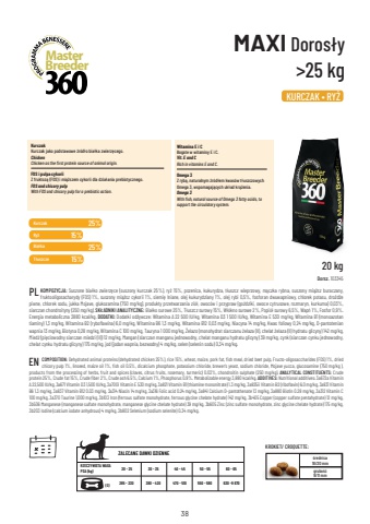 38Kurczak Ry%u017c Bia%u0142ka T%u0142uszcze 25% 15% 25% 15% MAXI Doros%u0142y >25 kg KOMPOZYCJA: Suszone bia%u0142ko zwierz%u0119ce (suszony kurczak 25%), ry%u017c 15%, pszenica, kukurydza, t%u0142uszcz wieprzowy, m%u0105czka rybna, suszony mi%u0105%u017csz buraczany, fruktooligosacharydy (FOS) 1%, suszony mi%u0105%u017csz cykorii 1%, siemi%u0119 lniane, olej kukurydziany 1%, olej rybi 0,5%, fosforan dwuwapniowy, chlorek potasu, dro%u017cd%u017ce piwne, chlorek sodu, jukka Mojave, glukozamina (750 mg/kg), produkty przetwarzania zi%u00f3%u0142, owoc%u00f3w i przypraw (go%u017adziki, owoce cytrusowe, rozmaryn, kurkuma) 0,03%, siarczan chondroityny (250 mg/kg). SK%u0141ADNIKI ANALITYCZNE: Bia%u0142ko surowe 25%, T%u0142uszcz surowy 15%, W%u0142%u00f3kno surowe 2%, Popi%u00f3%u0142 surowy 6,5%, Wap%u0144 1%, Fosfor 0,9%. Energia metaboliczna 3880 kcal/kg. DODATKI: Dodatki od%u017cywcze: Witamina A 22 500 IU/kg, Witamina D3 1 500 IU/kg, Witamina E 530 mg/kg, Witamina B1 (monoazotan tiaminy) 1,3 mg/kg, Witamina B2 (ryboflawina) 6,0 mg/kg, Witamina B6 1,3 mg/kg, Witamina B12 0,03 mg/kg, Niacyna 14 mg/kg, Kwas foliowy 0,24 mg/kg, D-pantotenian wapnia 13 mg/kg, Biotyna 0,28 mg/kg, Witamina C 100 mg/kg, Tauryna 1 000 mg/kg, %u017belazo (monohydrat siarczanu %u017celaza (II), chelat %u017celaza (II) hydratu glicyny) 142 mg/kg, Mied%u017a (pi%u0119ciowodny siarczan miedzi (II)) 12 mg/kg, Mangan (siarczan manganu jednowodny, chelat manganu hydratu glicyny) 39 mg/kg, cynk (siarczan cynku jednowodny, chelat cynku hydratu glicyny) 175 mg/kg, jod (jodan wapnia, bezwodny) 4 mg/kg, selen (selenin sodu) 0,34 mg/kg. PL BreederMaster20 kg Dorsz. 103345 %u015brednica 18/20 mm grubo%u015b%u01079/11 mm KROKIET/ CROQUETTE: Omega 3 Z ryb%u0105, naturalnym %u017ar%u00f3d%u0142em kwas%u00f3w t%u0142uszczowych Omega 3, wspomagaj%u0105cych uk%u0142ad kr%u0105%u017cenia. Omega 3With fish, natural source of Omega 3 fatty acids, to support the circulatory system.Witamina E i C Bogate w witaminy E i C. Vit. E and CRich in vitamins E and C.Kurczak Kurczak jako podstawowe %u017ar%u00f3d%u0142o bia%u0142ka zwierz%u0119cego. ChickenChicken as the first protein source of animal origin.FOS i pulpa cykorii Z fruktoz%u0105 (FOS) i mi%u0105%u017cszem cykorii dla dzia%u0142ania prebiotycznego. FOS and chicory pulpWith FOS and chicory pulp for a prebiotic action.KURCZAK %u2022 RY%u017b ZALECANE DAWKI DZIENNE(G) RZECZYWISTA WAGA PSA (kg) 20 - 25 30 - 35 40 - 45 50 - 55 60 - 65 285 - 330 380 - 420 470 - 510 550 - 590 630 -9 670 COMPOSITION: Dehydrated animal proteins (dehydrated chicken 25%), rice 15%, wheat, maize, pork fat, fish meal, dried beet pulp, Fructo-oligosaccharides (FOS) 1%, dried chicory pulp 1%, linseed, maize oil 1%, fish oil 0.5%, dicalcium phosphate, potassium chloride, brewer%u2019s yeast, sodium chloride, Mojave yucca, glucosamine (750 mg/kg ), products from the processing of herbs, fruit and spices (cloves, citrus fruits, rosemary, turmeric) 0.03%, chondroitin sulphate (250 mg/kg). ANALYTICAL CONSTITUENTS: Crude protein 25%, Crude fat 15%, Crude fiber 2%, Crude ash 6.5%, Calcium 1%, Phosphorus 0.9%. Metabolizable energy 3,880 kcal/kg. ADDITIVES: Nutritional additives: 3a672a Vitamin A 22,500 IU/kg, 3a671 Vitamin D3 1,500 IU/kg, 3a700i Vitamin E 530 mg/kg, 3a821 Vitamin B1 (thiamine mononitrate) 1.3 mg/kg, 3a825ii Vitamin B2 (riboflavin) 6.0 mg/kg, 3a831 Vitamin B6 1.3 mg/kg, 3a837 Vitamin B12 0.03 mg/kg, 3a314 Niacin 14 mg/kg, 3a316 Folic acid 0.24 mg/kg, 3a841 Calcium D-pantothenate 13 mg/kg, 3a880 Biotin 0.28 mg/kg, 3a312 Vitamin C 100 mg/kg, 3a370 Taurine 1,000 mg/kg, 3b103 Iron (ferrous sulfate monohydrate, ferrous glycine chelate hydrate) 142 mg/kg, 3b405 Copper (copper sulfate pentahydrate) 12 mg/kg, 3b506 Manganese (manganese sulfate monohydrate, manganese glycine chelate hydrate) 39 mg/kg, 3b605 Zinc (zinc sulfate monohydrate, zinc glycine chelate hydrate) 175 mg/kg, 3b203 Iodine (calcium iodate anhydrous) 4 mg/kg, 3b802 Selenium (sodium selenite) 0.34 mg/kg.EN