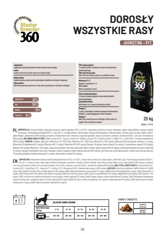 39JAGNI%u0118CINA %u2022 RY%u017b Jagni%u0119cina Ry%u017c Bia%u0142ka T%u0142uszcze 20% 20% 25% 14% DOROS%u0141Y WSZYSTKIE RASY KOMPOZYCJA: Suszone bia%u0142ko zwierz%u0119ce (suszony mi%u0105%u017csz jagni%u0119cy 20%), ry%u017c 20%, kukurydza, pszenica, t%u0142uszcz zwierz%u0119cy, gluten kukurydziany, suszony mi%u0105%u017csz buraczany, fruktooligosacharydy (FOS) 1%, olej rybi 1%, dro%u017cd%u017ce piwne, suszone jaja, fosforan dwuwapniowy, chlorek potasu, chlorek sodu, suszony mi%u0105%u017csz cykorii, jukka Mojave, glukozamina (450 mg/kg), produkty przetwarzania zi%u00f3%u0142, owoc%u00f3w i przypraw (go%u017adziki, owoce cytrusowe, rozmaryn, kurkuma) 0,03%, siarczan chondroityny (100 mg/kg). SK%u0141ADNIKI ANALITYCZNE: Bia%u0142ko surowe 25%, T%u0142uszcz surowy 14%, W%u0142%u00f3kno surowe 2,2%, Popi%u00f3%u0142 surowy 7%, Wap%u0144 1,2%, Fosfor 0,9%. Energia metaboliczna 3800 kcal/kg. DODATKI: Dodatki od%u017cywcze: Witamina A 22 500 IU/kg, Witamina D3 1 500 IU/kg, Witamina E 500 mg/kg, Witamina B1 (monoazotan tiaminy) 1,3 mg/kg, Witamina B2 (ryboflawina) 6,1 mg/kg, Witamina B6 1,3 mg/kg, Witamina B12 0,03 mg/kg, Niacyna 15 mg/kg, Kwas foliowy 0,24 mg/kg, D-pantotenian wapnia 13,5 mg/kg, Biotyna 0,29 mg/kg, Witamina C 130 mg/kg, %u017belazo (monohydrat siarczanu %u017celaza (II), hydrat chelatu glicyny %u017celaza (II)) 137 mg/kg, mied%u017a (pi%u0119ciowodny siarczan miedzi (II)) 12 mg/kg, mangan (monohydrat siarczanu manganu, hydrat manganu) chelat hydratu glicyny) 38,8 mg/kg, cynk (siarczan cynku jednowodny, chelat cynku hydratu glicyny) 175 mg/kg, jod (jodan wapnia bezwodny) 4,1 mg/kg, selen (selenin sodu) 0,34 mg/kg. PL BreederMaster20 kg Dorsz. 103346 %u015brednica 14/15 mm  grubo%u015b%u01076/7 mm KROKIET/ CROQUETTE: ZALECANE DAWKI DZIENNE(G) RZECZYWISTA WAGA PSA (kg) 5 - 10 15 - 20 25 - 30 35 - 40 45 - 50 100 - 150 210 - 255 300 - 345 385 - 425 485 - 505 Jagni%u0119cina Jagni%u0119cina jako podstawowe %u017ar%u00f3d%u0142o bia%u0142ka zwierz%u0119cego. LambLamb as the first protein source of animal origin.Glukozamina Z glukozamin%u0105, prekursorem g%u0142%u00f3wnego sk%u0142adnika chrz%u0105stki stawowej. GlucosamineWith Glucosamine, precursor of the main constituent of articular cartilage.FOS i pulpa cykorii Z fruktoz%u0105 (FOS) i mi%u0105%u017cszem cykorii dla dzia%u0142ania prebiotycznego. FOS and chicory pulpWith FOS and chicory pulp for a prebiotic action.Zio%u0142a antyoksydacyjne Z zio%u0142ami zapewniaj%u0105cymi naturalne dzia%u0142anie antyoksydacyjne. Antioxidant herbsWith herbs for a natural antioxidant effect.Omega 3 Z ryb%u0105, naturalnym %u017ar%u00f3d%u0142em kwas%u00f3w t%u0142uszczowych Omega 3, wspomagaj%u0105cych uk%u0142ad kr%u0105%u017cenia. Omega 3With fish, natural source of Omega 3 fatty acids, to support the circulatory system.Witamina E i C Bogate w witaminy E i C. Vit. E and CRich in vitamins E and C.COMPOSITION: Dehydrated animal proteins (dehydrated lamb 20%), rice 20%, maize, wheat, animal fat, maize gluten, dried beet pulp, Fructo-oligosaccharides (FOS) 1%, fish oil 1%, brewer%u2019s yeast, dried eggs, dicalcium phosphate, potassium chloride, sodium chloride, dried chicory pulp, Mojave yucca, glucosamine (450 mg/kg ), products from the processing of herbs, fruit and spices (cloves, citrus fruits, rosemary, turmeric) 0.03%, chondroitin sulphate (100 mg/kg). ANALYTICAL CONSTITUENTS: Crude protein 25%, Crude fat 14%, Crude fiber 2.2%, Crude ash 7%, Calcium 1.2%, Phosphorus 0.9%. Metabolizable energy 3,800 kcal/kg. ADDITIVES: Nutritional additives: 3a672a Vitamin A 22,500 IU/kg, 3a671 Vitamin D3 1,500 IU/kg, 3a700i Vitamin E 500 mg/kg, 3a821 Vitamin B1 (thiamine mononitrate) 1.3 mg/kg, 3a825ii Vitamin B2 (riboflavin) 6.1 mg/kg, 3a831 Vitamin B6 1.3 mg/kg, 3a837 Vitamin B12 0.03 mg/kg, 3a314 Niacin 15 mg/kg, 3a316 Folic acid 0.24 mg/kg, 3a841 Calcium D-pantothenate 13.5 mg/kg, 3a880 Biotin 0.29 mg/kg, 3a312 Vitamin C 130 mg/kg, 3b103 Iron (ferrous sulfate monohydrate, ferrous glycine chelate hydrate) 137 mg/kg, 3b405 Copper (copper sulfate pentahydrate) 12 mg/kg, 3b506 Manganese (manganese sulfate monohydrate, manganese glycine chelate hydrate) 38.8 mg/kg, 3b605 Zinc (zinc sulfate monohydrate, zinc glycine chelate hydrate) 175 mg/kg, 3b203 Iodine (calcium iodate anhydrous) 4.1 mg/kg, 3b802 Selenium (sodium selenite) 0.34 mg/kg.EN