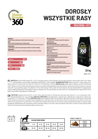 40Wo%u0142owina Ry%u017c Bia%u0142ka T%u0142uszcze 26% 20% 25% 14,5% WO%u0141OWINA %u2022 RY%u017b DOROS%u0141Y WSZYSTKIE RASY KOMPOZYCJA: Suszone bia%u0142ko wo%u0142owe 26%, ry%u017c 20%, kukurydza, pszenica, t%u0142uszcz wieprzowy, suszony mi%u0105%u017csz buraczany, suszony mi%u0105%u017csz cykorii, olej z %u0142ososia 1%, olej kukurydziany, suszone dro%u017cd%u017ce, fruktooligosacharydy (FOS) 0,1%, jukka schidigera. SK%u0141ADNIKI ANALITYCZNE: Bia%u0142ko surowe 25,0%, T%u0142uszcz surowy 14,5%, W%u0142%u00f3kno surowe 2,2%, Popi%u00f3%u0142 surowy 7,3%, Wap%u0144 1,6%, Fosfor 1,0%. ME: 3780 kcal/kg %u2013 15,8 MJ/kg. DODATKI (na kg): Dodatki od%u017cywcze: Witamina A 22 500 IU, Witamina D3 1 500 IU, Witamina E 530 mg, Witamina B1 (monoazotan tiaminy) 1,3 mg, Witamina B2 (ryboflawina) 6 mg, Witamina B6 1,3 mg, Witamina B12 0,03 mg, Niacyna 14 mg, Kwas foliowy 0,24 mg, D-pantotenian wapnia 13 mg, Witamina C 70 mg, Chlorek choliny 1 500 mg, %u017belazo 137 mg (monohydrat siarczanu %u017celaza (II)), Mied%u017a 12 mg (pi%u0119ciowodny siarczan miedzi (II)), Mangan 38,5 mg (monohydrat siarczanu manganu), Cynk 175 mg (monohydrat siarczanu cynku), Jod 4 mg (bezwodny jodan wapnia), Selen 0,34 mg (selenin sodu). Dodatki organoleptyczne: Castanea sativa. PL BreederMaster20 kg Dorsz. 217002 %u015brednica 14/15 mm grubo%u015b%u01076/7 mm KROKIET/ CROQUETTE: ZALECANE DAWKI DZIENNE(G) RZECZYWISTA WAGA PSA (kg) 5 - 10 15 - 20 25 - 30 35 - 40 45 - 50 100 - 150 210 - 255 300 - 345 385 - 425 485 - 505 Wo%u0142owina Wo%u0142owina jako podstawowe %u017ar%u00f3d%u0142o bia%u0142ka zwierz%u0119cego. BeefBeef as the first protein source of animal origin.Glukozamina Z glukozamin%u0105, prekursorem g%u0142%u00f3wnego sk%u0142adnika chrz%u0105stki stawowej. GlucosamineWith Glucosamine, precursor of the main constituent of articular cartilage.FOS i pulpa cykorii Z fruktoz%u0105 (FOS) i mi%u0105%u017cszem cykorii dla dzia%u0142ania prebiotycznego. FOS and chicory pulpWith FOS and chicory pulp for a prebiotic action.Zio%u0142a antyoksydacyjne Z zio%u0142ami zapewniaj%u0105cymi naturalne dzia%u0142anie antyoksydacyjne. Antioxidant herbsWith herbs for a natural antioxidant effect.Omega 3 Z ryb%u0105, naturalnym %u017ar%u00f3d%u0142em kwas%u00f3w t%u0142uszczowych Omega 3, wspomagaj%u0105cych uk%u0142ad kr%u0105%u017cenia. Omega 3With fish, natural source of Omega 3 fatty acids, to support the circulatory system.Witamina E i C Bogate w witaminy E i C. Vit. E and CRich in vitamins E and C.COMPOSITION: Dehydrated beef protein 26%, rice 20%, maize, wheat, pork animal fat, dried beet pulp, dried chicory pulp, salmon oil 1%, corn oil, dried yeasts, fructooligosaccharides (FOS ) 0.1%, yucca schidigera. ANALYTICAL CONSTITUENTS: Crude protein 25.0%, Crude fats 14.5%, Crude fibers 2.2%, Crude ash 7.3%, Calcium 1.6%, Phosphorus 1.0%. ME: 3.780 kcal/kg %u2013 15.8 MJ/kg. ADDITIVES (for kg): Nutritional additives: 3a672a Vitamin A 22,500 IU, 3a671 Vitamin D3 1,500 IU, 3a700i Vitamin E 530 mg, 3a821 Vitamin B1 (thiamine mononitrate) 1.3 mg, 3a825ii Vitamin B2 (riboflavin) 6 mg, 3a831 Vitamin B6 1.3 mg, 3a837 Vitamin B12 0.03 mg, 3a314 Niacin 14 mg, 3a316 Folic acid 0.24 mg, 3a841 Calcium D-pantothenate 13 mg, 3a312 Vitamin C 70 mg, 3a890 Choline chloride 1,500 mg, 3b103 Iron 137 mg (ferrous sulfate monohydrate), 3b405 Copper 12 mg (copper sulfate pentahydrate), 3b506 Manganese 38.5 mg (manganous sulfate monohydrate), 3b605 Zinc 175 mg (zinc sulfate monohydrate), 3b203 Iodine 4 mg (calcium iodate anhydrous), 3b802 Selenium 0.34 mg (sodium selenite). Organoleptic additives: Castanea sativa.EN