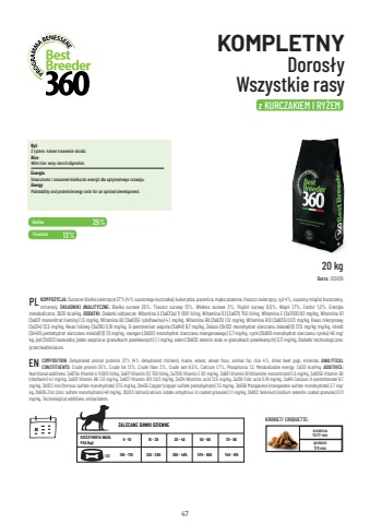 47Bia%u0142ka T%u0142uszcze 25% 13% KOMPOZYCJA: Suszone bia%u0142ko zwierz%u0119ce 27% (4% suszonego kurczaka), kukurydza, pszenica, m%u0105ka pszenna, t%u0142uszcz zwierz%u0119cy, ry%u017c 4%, suszony mi%u0105%u017csz buraczany, minera%u0142y. SK%u0141ADNIKI ANALITYCZNE: Bia%u0142ko surowe 25%, T%u0142uszcz surowy 13%, W%u0142%u00f3kno surowe 3%, Popi%u00f3%u0142 surowy 8,5%, Wap%u0144 1,7%, Fosfor 1,2%. Energia metaboliczna: 3630 kcal/kg. DODATKI: Dodatki od%u017cywcze: Witamina A (3a672a) 11 000 IU/kg, Witamina D3 (3a671) 750 IU/kg, Witamina E (3a700i) 82 mg/kg, Witamina B1 (3a821 mononitrat tiaminy) 1,5 mg/kg, Witamina B2 (3a825ii ryboflawina) 4,1 mg/kg, Witamina B6 (3a831) 1,12 mg/kg, Witamina B12 (3a835) 0,03 mg/kg, Kwas nikotynowy (3a314) 13,5 mg/kg, Kwas foliowy (3a316) 0,19 mg/kg, D-pantotenian wapnia (3a841) 9,7 mg/kg, %u017belazo (3b103 monohydrat siarczanu %u017celaza(II)) 37,5 mg/kg mg/kg, mied%u017a (3b405 pentahydrat siarczanu miedzi(II)) 7,5 mg/kg, mangan (3b503 monohydrat siarczanu manganawego) 3,7 mg/kg, cynk (3b605 monohydrat siarczanu cynku) 48 mg/kg, jod (3b203 bezwodny jodan wapnia w granulkach powlekanych) 1,1 mg/kg, selen (3b802 selenin sodu w granulkach powlekanych) 0,11 mg/kg. Dodatki technologiczne: przeciwutleniacze. PL 20 kg Dorsz. 103638 %u015brednica 15/17 mm  grubo%u015b%u01077/9 mm KROKIET/ CROQUETTE: z KURCZAKIEM I RY%u017bEM Ry%u017c Z ry%u017cem: %u0142atwe trawienie skrobi. RiceWith rice: easy starch digestion.Energia Smaczno%u015b%u0107 i stosunek bia%u0142ka do energii dla optymalnego rozwoju.EnergyPalatability and protein/energy ratio for an optimal development.ZALECANE DAWKI DZIENNE(G) RZECZYWISTA WAGA PSA (kg) 5 - 10 15 - 20 30 - 40 50 - 60 70 - 80 105 - 170 235 - 290 390 - 465 575 - 660 740 - 815 KOMPLETNY Doros%u0142y Wszystkie rasy COMPOSITION: Dehydrated animal proteins 27% (4% dehydrated chicken), maize, wheat, wheat flour, animal fat, rice 4%, dried beet pulp, minerals. ANALYTICAL CONSTITUENTS: Crude protein 25%, Crude fat 13%, Crude fiber 3%, Crude ash 8.5%, Calcium 1.7%, Phosphorus 1.2. Metabolizable energy: 3,630 kcal/kg. ADDITIVES:Nutritional additives: 3a672a Vitamin A 11,000 IU/kg, 3a671 Vitamin D3 750 IU/kg, 3a700i Vitamin E 82 mg/kg, 3a821 Vitamin B1 (thiamine mononitrate) 1.5 mg/kg, 3a825ii Vitamin B2 (riboflavin) 4.1 mg/kg, 3a831 Vitamin B6 1.12 mg/kg, 3a837 Vitamin B12 0.03 mg/kg, 3a314 Nicotinic acid 13.5 mg/kg, 3a316 Folic acid 0.19 mg/kg, 3a841 Calcium D-pantothenate 9.7 mg/kg, 3b103 Iron (ferrous sulfate monohydrate) 37.5 mg/kg, 3b405 Copper (copper sulfate pentahydrate) 7.5 mg/kg, 3b506 Manganese (manganese sulfate monohydrate) 3.7 mg/kg, 3b605 Zinc (zinc sulfate monohydrate) 48 mg/kg, 3b203 Iodine (calcium iodate anhydrous in coated granules) 1.1 mg/kg, 3b802 Selenium (sodium selenite coated granules) 0.11 mg/kg. Technological additives: antioxidants.EN