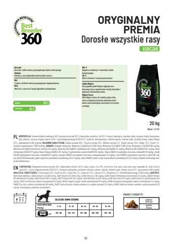 51Bia%u0142ka T%u0142uszcze 25% 16% KOMPOZYCJA: Suszone bia%u0142ko zwierz%u0119ce 26% (suszony kurczak 20%), kukurydza, pszenica, ry%u017c 10%, t%u0142uszcz zwierz%u0119cy, m%u0105czka rybna, suszony mi%u0105%u017csz buraczany, olej ro%u015blinny, suszony mi%u0105%u017csz cykorii 0,5%, fruktooligosacharydy (FOS) 0,5%, fosforan dwuwapniowy, chlorek potasu, chlorek sodu, dro%u017cd%u017ce piwne, jukka Mojave 0,1%, glukozamina (400 mg/kg). SK%u0141ADNIKI ANALITYCZNE: Bia%u0142ko surowe 25%, T%u0142uszcz surowy 16%, W%u0142%u00f3kno surowe 3%, Popi%u00f3%u0142 surowy 7,5%, Wap%u0144 1,3%, Fosfor 1%. Energia metaboliczna: 3780 kcal/kg. DODATKI: Dodatki od%u017cywcze: Witamina A (3a672a) 22 500 IU/kg, Witamina D3 (3a671) 1 500 IU/kg, Witamina E (3a700i) 165 mg/kg, Witamina B1 (3a821 mononitrat tiaminy) 3,0 mg/kg, Witamina B2 (3a825ii ryboflawina) 8,2 mg/kg, Witamina B6 (3a831) 2,2 mg/kg, Witamina B12 (3a835) 0,07 mg/kg, Kwas nikotynowy (3a314) 27 mg/kg, Kwas foliowy (3a316) 0,37 mg/kg, D-pantotenian wapnia (3a841) 19,5 mg/kg, %u017belazo (3b103 monohydrat siarczanu %u017celaza(II)) 75 mg/kg, mied%u017a (3b405 pentahydrat siarczanu miedzi(II)) 15 mg/kg, mangan (3b503 monohydrat siarczanu manganawego) 7,5 mg/kg, cynk (3b605 monohydrat siarczanu cynku) 96 mg/kg, jod (3b203 bezwodny jodan wapnia w granulkach powlekanych) 2,2 mg/kg, selen (3b802 selenin sodu w granulkach powlekanych) 0,22 mg/kg. Dodatki technologiczne: przeciwutleniacze. PL 20 kg Dorsz. 103869 %u015brednica 13/15 mm  grubo%u015b%u01077/8 mm KROKIET/ CROQUETTE: KURCZAK ZALECANE DAWKI DZIENNE(G) RZECZYWISTA WAGA PSA (kg) 5 - 10 15 - 20 30 - 40 50 - 60 70 - 80 100 - 165 225 - 275 375 - 465 550 - 630 705 - 780 ORYGINALNY PREMIA Doros%u0142e wszystkie rasy Wit. E Bogate w witamin%u0119 E: naturalny %u015brodek konserwuj%u0105cy. Vit. ERich in Vitamin E: natural preservation.Jukka Mojave W przypadku jukki Mojave odgrywa ona kluczow%u0105 rol%u0119 w ograniczaniu emisji amoniaku i poprawie wch%u0142aniania azotu. Mojave YuccaWith Mojave Yucca, for a better plays a key role in mitigating ammonia emissions and a better azote absorption.constituent of articular cartilage.Kurczak Kurczak, %u017ar%u00f3d%u0142o %u0142atwo przyswajalnego bia%u0142ka zwierz%u0119cego. ChickenChicken, a very digestible animal protein source.Ry%u017c Z ry%u017cem, %u017ar%u00f3d%u0142em %u0142atwo przyswajalnych w%u0119glowodan%u00f3w. RiceWith rice, a source of easily digestible carbohydrates.COMPOSITION: Dehydrated animal proteins 26% (dehydrated chicken 20%), maize, wheat, rice 10%, animal fat, fish meal, dried beet pulp, vegetable oil, dried chicory pulp 0.5%, Fructo-oligosaccharides (FOS) 0,5%, dicalcium phosphate, potassium chloride, sodium chloride, brewer%u2019s yeast, Mojave yucca 0.1%, glucosamine (400 mg/kg).ANALYTICAL CONSTITUENTS: Crude protein 25%, Crude fat 16%, Crude fiber 3%, Crude ash 7.5%, Calcium 1.3%, Phosphorus 1%. Metabolisable energy: 3,780 kcal/kg. ADDITIVES:Nutritional additives: 3a672a Vitamin A 22,500 IU/kg, 3a671 Vitamin D3 1,500 IU/kg, 3a700i Vitamin E 165 mg/kg, 3a821 Vitamin B1 (thiamine mononitrate) 3.0 mg/kg, 3a825ii Vitamin B2 (riboflavin) 8.2 mg/kg, 3a831 Vitamin B6 2.2 mg/kg, 3a837 Vitamin B12 0.07 mg/kg, 3a314 Nicotinic acid 27 mg/kg, 3a316 Folic acid 0.37 mg/kg, 3a841 Calcium D-pantothenate 19.5 mg/kg, 3b103 Iron (ferrous sulfate monohydrate) 75 mg/kg, 3b405 Copper (copper sulfate pentahydrate) 15 mg/kg, 3b506 Manganese (manganese sulfate monohydrate) 7.5 mg/kg, 3b605 Zinc (zinc sulfate monohydrate) 96 mg/kg, 3b203 Iodine (calcium iodate anhydrous in coated granules) 2.2 mg/kg, 3b802 Selenium (sodium selenite coated granules) 0.22 mg/kg. Technological additives: antioxidants.EN